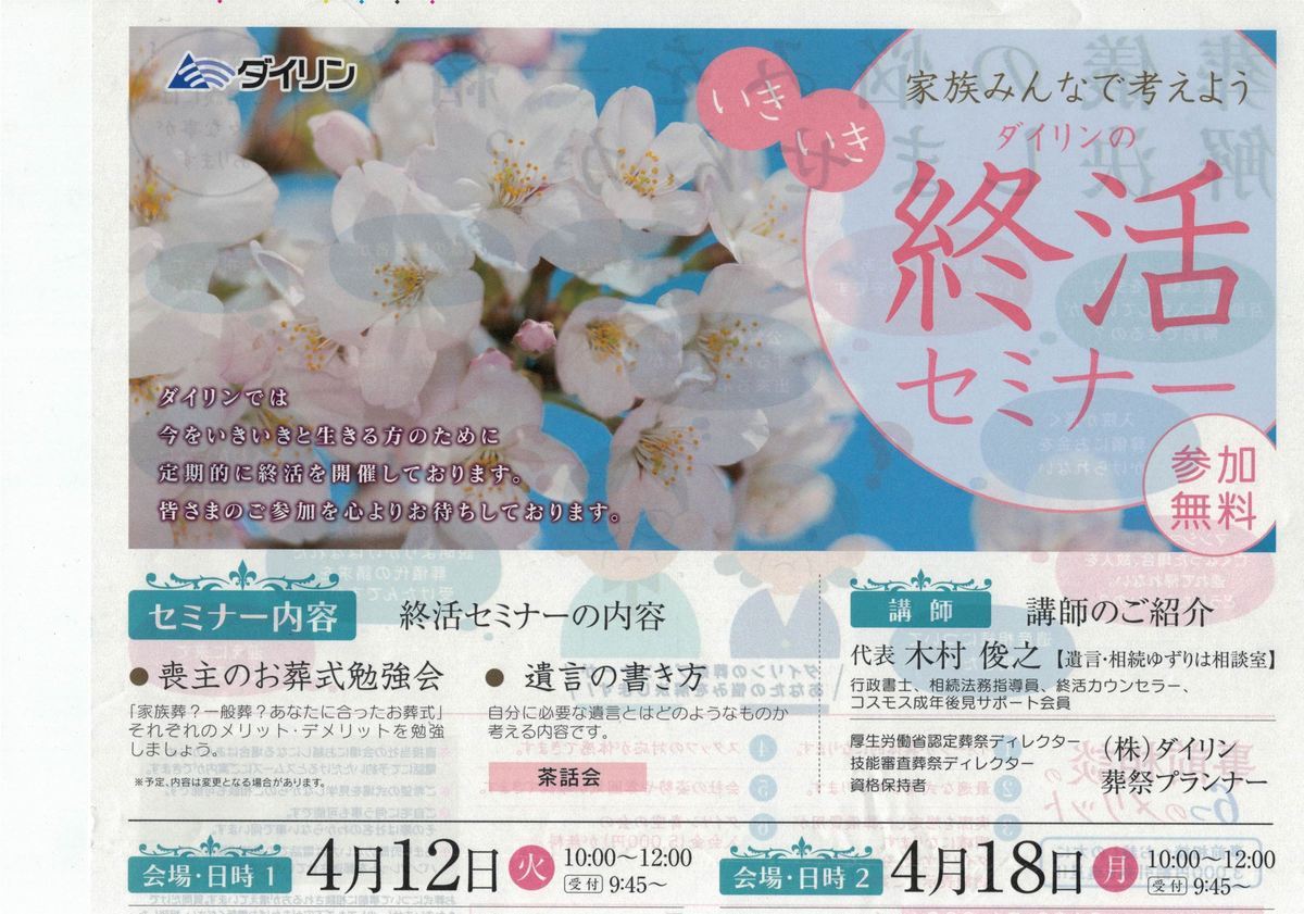 埼玉県行田市、羽生市を中心に事業展開をされている葬儀社ダイリン様主催の終活セミナーが開催され、講師を務めます。